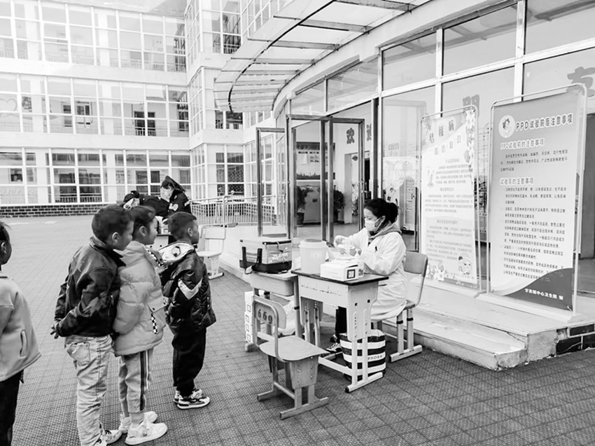 圖為醫(yī)護人員到學(xué)校開展預(yù)防接種工作。