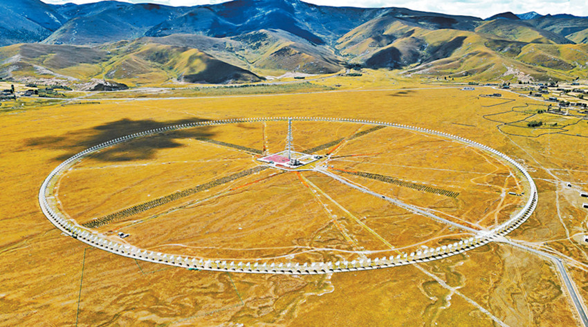 飛機(jī)從稻城亞丁機(jī)場起飛,右側(cè)舷窗外的地面隱現(xiàn)一個(gè)小圓點(diǎn),因?yàn)樵煨吞厥猓?dāng)?shù)厝朔Q“千眼天珠”。小圓點(diǎn)其實(shí)一點(diǎn)也不“小”——在海拔3820米的甘孜州稻城縣噶通鎮(zhèn),313部直徑6米的天線,均勻地分布在直徑1公里的圓環(huán)上。它的正式名字叫圓環(huán)陣太陽射電成像望遠(yuǎn)鏡(下稱“圓環(huán)陣”),是國家重大科技基礎(chǔ)設(shè)施空間環(huán)境地基綜合監(jiān)測網(wǎng)(子午工程二期)的標(biāo)志性設(shè)備之一,也是目前已建成的全球規(guī)模最大的綜合孔徑射電望遠(yuǎn)鏡。其任務(wù)主要是對(duì)太陽和日地空間傳播鏈條進(jìn)行高質(zhì)量監(jiān)測,監(jiān)測太陽“打噴嚏”。