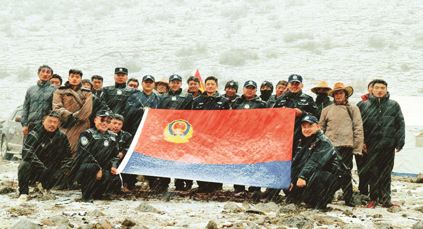 然而,高原的天、娃娃的臉,說變就變。剛剛還艷陽高照的晴好天氣,瞬間寒風四起,鵝毛大雪不一會便覆蓋了整個山野。由于到達蟲草采集點還需4、50分鐘人力轉運物資,受天氣影響,前行受阻,擔任護送任務的民輔警當即幫助群眾搭建臨時安置點,風雪中警民互助的身影像極了一家人。一切收拾停當,盡管風寒雪大,條件艱辛,樂觀的群眾和伴隨服務的民輔警還不忘在風雪中來一張合照,他們說,這是歷年來的慣例,每次上山采集蟲草和下山返程,他們都會一個不少地拍張“全家福”,以此留念蟲草季警民相依的美好記憶。