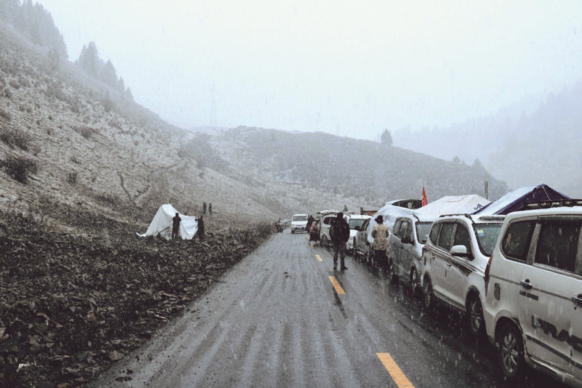 數十輛小客車、摩托車、小貨車交織的蟲草采集隊伍在蜿蜒的道路上行程近2小時,通過民輔警和鄉黨政工作人員的貼心護送,60多名群眾終于安全到達魯然蟲草山下。