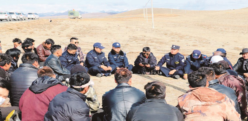 稍作休整,為了讓蟲草采集群眾和隨行的數十臺各型車輛安全到達魯然蟲草山,派出所民輔警和鄉鎮工作人員組織群眾席地而坐召開壩壩會,核查入山證,講明道路交通安全、森林草原防火知識,提醒群眾遵紀守法、文明進山。
