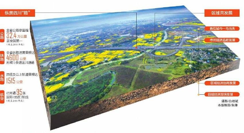 全國第四大航空樞紐地位鞏固。成都雙流國際機場年旅客吞吐量突破4000萬人次,跨越至“全國第四場”。國際化步伐加快,在中西部地區率先實現五大洲都有直航航點,至2016年底,已開通95條國際(地區)航線,較2012年翻番還多。 精準扶貧,交通先行。四川省脫貧攻堅專項資金,一半投向交通基礎設施建設;連續實施兩輪甘孜州交通建設推進工程和涼山州交通建設推進工程,集中力量抓好農村公路建設和渡改橋,貧困地區交通基礎設施條件得到極大改善。目前,全省97.2%的鄉鎮通油路、92%的建制村通硬化路。