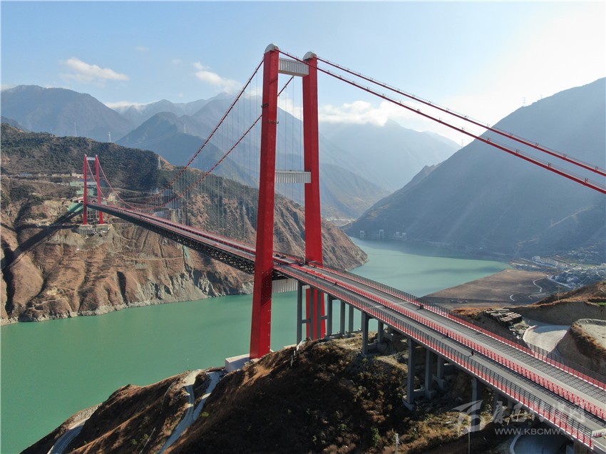 而瀘定大渡河大橋作為雅康高速全線“一橋一隧”重點控制性工程之一,是一座建設在高海拔、高地震烈度帶、復雜風場及溫度場環境下的超大跨徑鋼桁梁懸索橋,全橋長1411米,主跨1100米,橋面至大渡河水面239米,被譽為“川藏第一橋”。