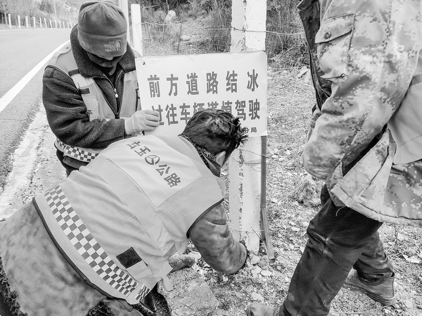 冬季氣溫下降,在夜晚形成結(jié)冰現(xiàn)象,易造成汽車打滑,難以控制,對過往車輛安全造成極大威脅。白玉公路分局出動人員 450 人、 車輛72輛次,對管養(yǎng)轄區(qū)道路全線進(jìn)行警示牌的安裝。同時(shí),對有暗冰、陰山積雪等路段及時(shí)拋灑防滑沙和融雪劑,確保道路行駛安全。