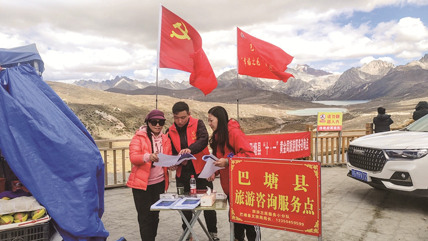 圖為在國道318線海子山觀景臺巴塘縣志愿者為旅客提供服務保障。