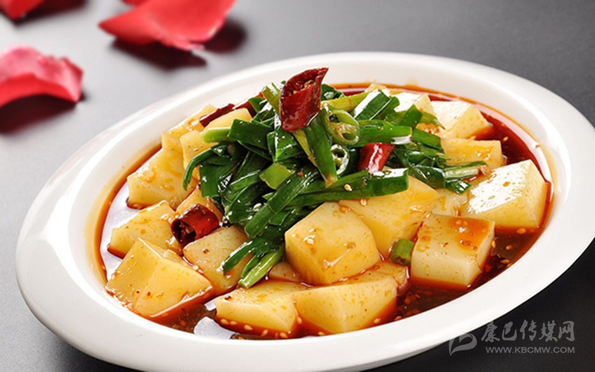 3、攪團:將清水在鍋內燒開后,逐量撒入極細的玉米面粉,以當年新產的小金黃玉米粉為佳,用竹筷攪拌,此時灶中火要猛,直到攪成糊狀,然后蒙蓋一層新鮮潔凈的芭蕉葉或青菜葉,再蓋上鍋蓋文火蒸20—30分鐘,用大碗盛起;鍋內打油湯,燒煮酸油菜湯,其油鹽調料如一般湯羹(酸油菜即以野生油菜莖葉,洗凈,在開水鍋內略煮一下,即撈起置于木盆或瓷盆內,趁熱壓緊覆蓋閉氣,隔夜后即成一種酸味菜,可炒食,亦可煮湯食,其味略酸而鮮美爽口,并有一種特殊香味,本地人歷來皆愛食之。