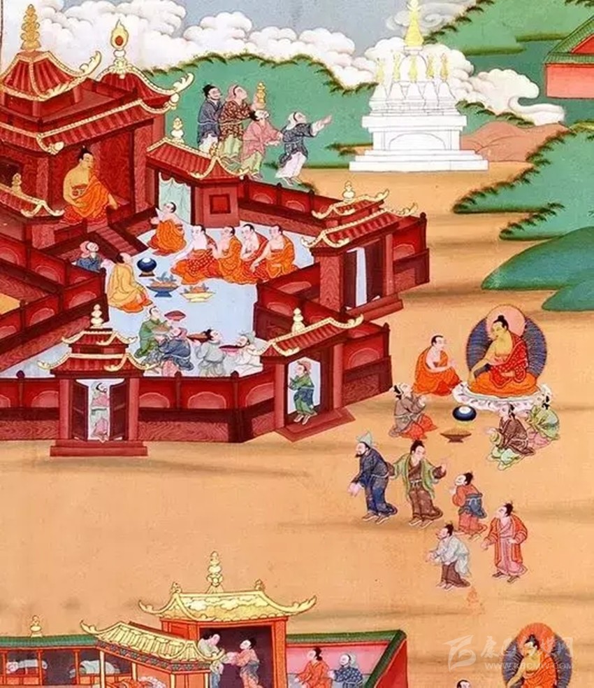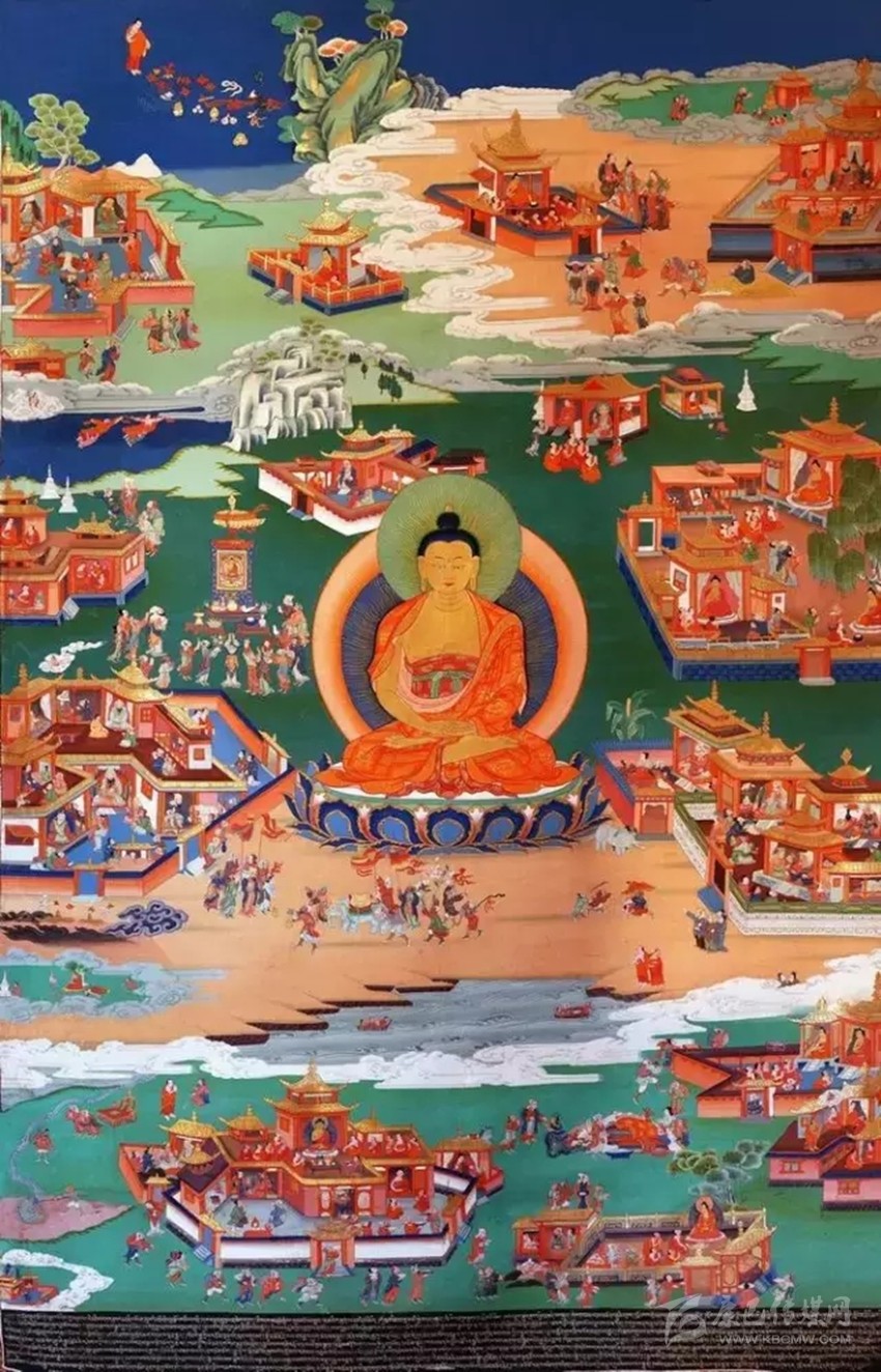這套《如意寶藤》唐卡畫是在十七世紀,東谷寺第六世活佛降巴更登嘉措命畫師郎卡杰繪制而成。傳說在十七世紀,在今爐霍縣境內的一個地方,有戶農民家生了一名聰明伶俐的小男孩,因其家境貧困從小就當童工,為別人放牧維持生活,其乳名為孜珠(牧童)。孜珠非常喜歡繪畫,平常利用放牧的空閑學畫,沒有紙張筆墨,晴天里他把地當紙,用小棍做筆, 陰天用石板作紙,小石子作筆每天堅持學習繪畫。他在極其艱苦的環境中,勤學好問,刻苦鉆研繪畫知識及其基本技巧。他刻苦學畫的恒心和誠意,感動了神仙畫師毗首羯摩。在一個良辰吉日神仙畫師來到人間收孜珠為徒,把自己的所有知識傳授于他。