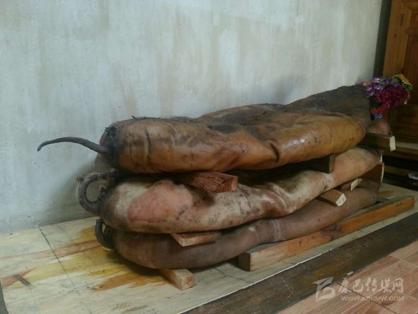 半干豬肉:在丹巴縣革什扎鄉有一種比較奇特的豬肉保存方法:將豬殺死后,不去毛,只在豬的腹部開一條口子取出內臟,將血水清理干凈后用麻繩將腹部縫合。隨后用當地的黃泥漿敷在豬身上,在豬的身上形成一個厚約2厘米的殼,密不透風。處理好后將其懸掛于灶塘之上,使黃泥在高溫的烘烤下快速硬化。如若發現黃泥層出現裂縫,立即用黃泥漿將其修復。等到第二年熱天時,敲掉黃泥形成的硬殼,豬毛被輕松退去,豬肉依然比較新鮮。但這種保存新鮮豬肉的方法現在已經很少見了,一是因為這種保存方法風險太大,稍有不慎豬肉就可能腐敗;二是如今物資供應豐富,新鮮豬肉購買方便,使得此種儲存方式失去了存在的價值。