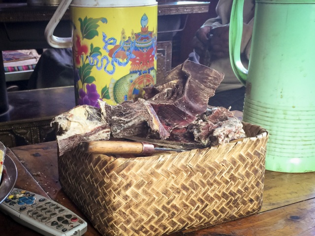 第二種吃法是,風干坨坨肉,通常是帶骨的風干肉,需要用藏刀割著吃,這也是最傳統的游牧藏族食肉方式。