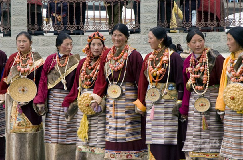 被稱為“瘋裝”的鄉城婦女服飾,最初形成于文成公主進藏時期,于云南麗江納西族木氏土司統治時期定型,并吸納納西族婦女穿的齊膝圍裙的形狀特點,它的特點是褶皺多,分內折、外折各54個。左右胸襟分別鑲有紅、黃、綠、黑、金五塊三角形布料,它們分別代表福壽、土地、先知、牲畜、財富。瘋裝,寄托著把人間福氣都聚齊了的寓意。雙袖肘處鑲有一片彩色布料,占整個衣袖的三分之一,袖邊嵌一小塊寸許寬綠布。裙鑲約1厘米粗的紅色羊毛條;背部嵌1.5尺見方稱為“公熱”的墊背。
