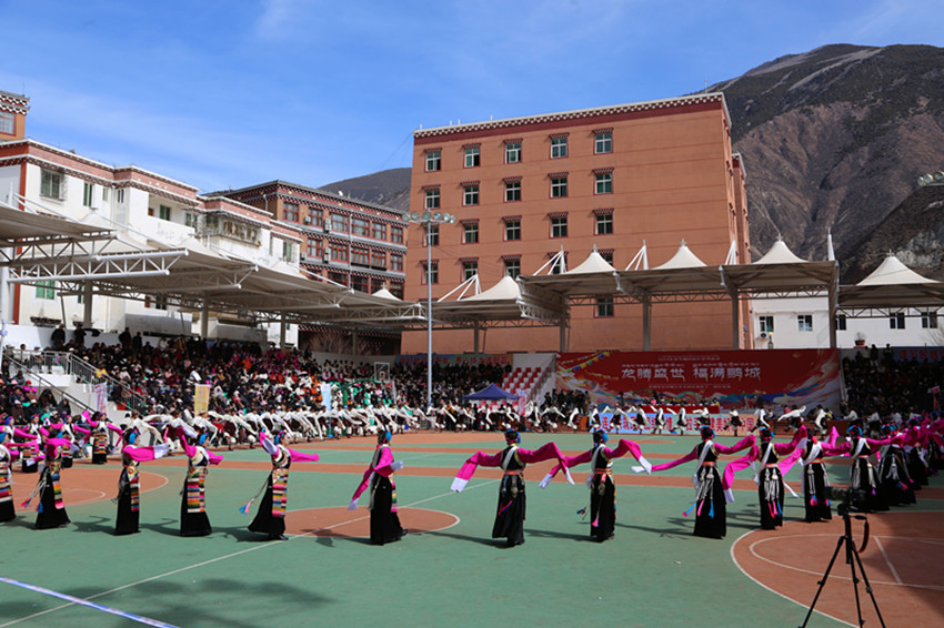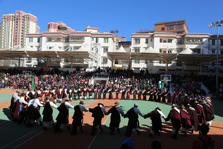 弦音聲動鬧新年,紅綾長袖舞春風,千人弦子鍋莊,唱出龍年大團圓,踏出幸福新舞步……2月13日,在巴塘縣全民健身活動中心舉行的春節暨藏歷新年系列活動“文化·點靚生活”——巴塘縣五彩藏鄉藝術周弦子鍋莊展演活動現場喜氣洋洋、人頭攢動,上千名群眾身穿節日盛裝,拉起弦胡,載歌載舞,共同慶祝新春佳節,祈盼龍年國泰民安、風調雨順。圖為活動現場。 敖梅 李穎/文 格桑澤仁/圖