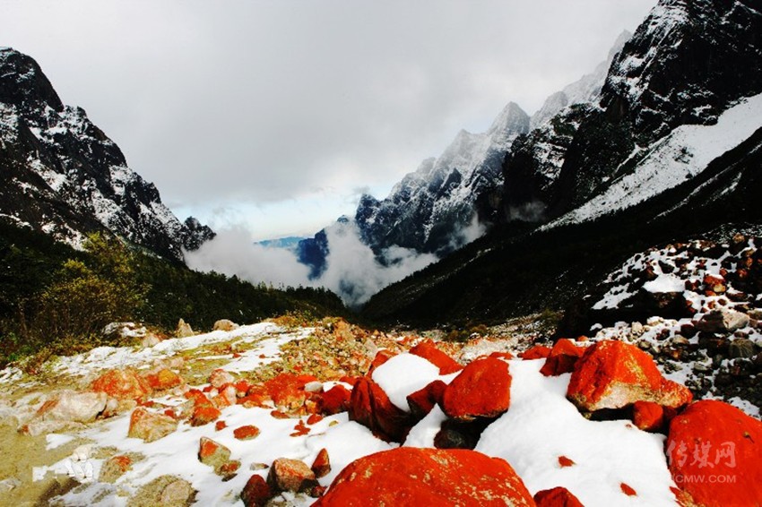 燕子溝最精華的景觀是紅石灘,此處為亞洲最大的紅石灘。石頭上布滿的紅色物質,是一種微生物,在高山特有的生態環境內得以繁衍,構成生命與歷史相融共存的奇特景觀。因為沙灘里的石頭都長了一層紅色的苔蘚,就好象沙灘里的石頭都穿上了喜慶的紅衣,使得燕子溝成了顏色的世界。據說只有在空氣質量很好的情況下,這種苔蘚才能夠生存,曾經有研究院的科學家為將這種石頭帶出去研究,結果剛下飛機,發現石頭上的紅色退了,因為空氣質量不好,導致石頭上的苔蘚無法生存。