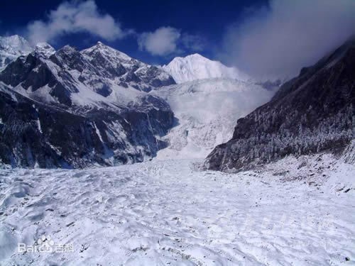沿冰川上行三公里,繞過黑松林,即可望見這條大冰瀑布。冰瀑布寬達(dá)1100米,落差1080米,由無(wú)數(shù)極其巨大的光芒四射的冰塊組成,仿佛從藍(lán)天直泄而下的一道銀河。除非你親眼見到,沒有任何詞匯能形容它的瑰麗笥偉大。冰川最高點(diǎn)的海撥為6750米,而最下端的海撥高度僅為2850米,它不但是低緯度低海撥的冰川,而且是落差最大的冰川。