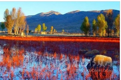 距稻城縣城金珠鎮28公里的桑堆小鎮風景綺麗,在公路沿線的牧場開闊平展,河流平緩如鏡。遙望遠處,在起伏的山巒間散落著村落、牧人、牛羊,呈現一派寧靜祥和的景象。公元1144年前,一世噶瑪巴·都松欽巴覺悟贊譽:“我走遍藏區,來到此地。這里風景秀美,牧草豐茂,六畜興旺,佛光普照。我愿在此修建寺廟成就功德”。金秋十月的桑堆紅草灘總是讓你感覺膠卷不夠用。