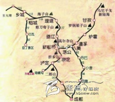 成都—瀘定橋(瀘定)—木格措、跑馬山、康定情歌城(康定)—雅家埂—燕子溝—海螺溝(磨西鎮)—安順場(石棉)—雅安—成都