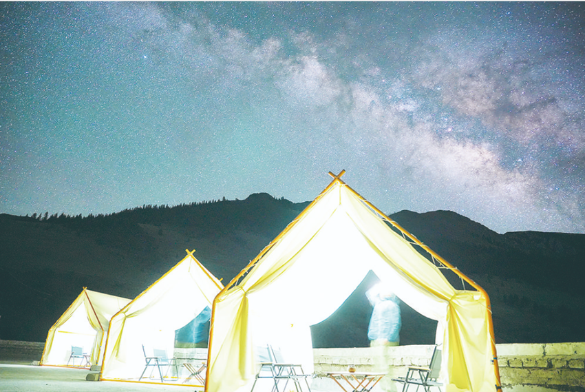 走進觀山悅嶺民宿,古樸的藏房與現代簡約設計風尚相互交融,三五游人閑庭信步、漫步在厚厚的草甸上,清風徐徐,坐在星空帳篷中,煮茶品茗,靜靜地感受著時光流淌。